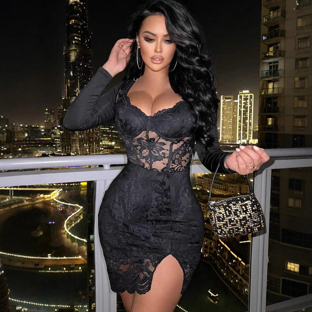 Lace Decor Cups Detail Long Sleeve Sexy European And American Dress